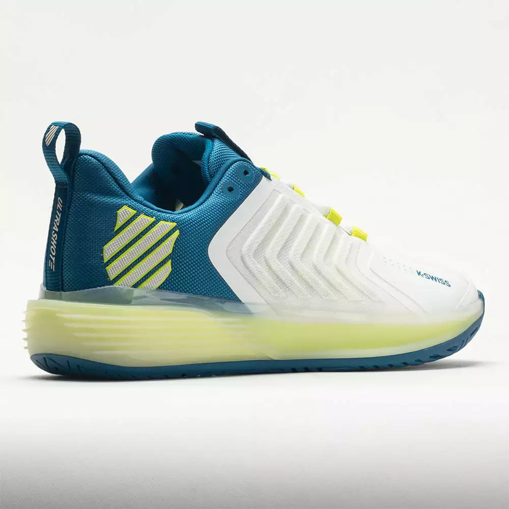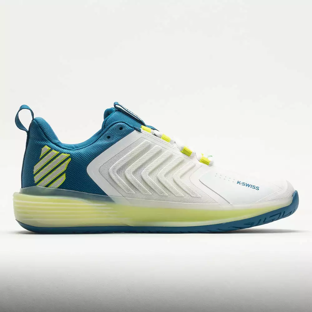 Built for the new wave of aggressive and powerful tennis players, the K-Swiss UltraShot 3 enables rapid movements. With a protective DuraWrap around the toe and DragGuardâ„¢ 7.0 technology in the heel, this tennis shoe protects you in key areas. Move confidently in any direction with the 360 Plantar Support Chassis in the midsole. Stay energized during long matches on the lightweight Surge 7.0 midsole. Built for fierce rallies against tough competition, the K-Swiss UltraShot 3 helps you play at a high level!