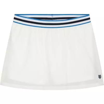 Bring a bit of retro back to the courts with the K-Swiss Core Team Skort with engineered with a simplistic classic blue stripe across the elasticated hem. This style of skirt has a built-in shortie, and a white mesh border. Colour: White Product Details Suitable for performance and recreational players High wearing comfort during exercise Elastic waistband Built-in shorts beneath skirt Lightweight high quality stretch material