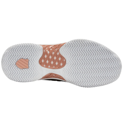 One of K-Swiss’ best-selling shoes, the Hypercourt Express 2 is a lightweight, comfortable, breathable shoe with a generous fit, making it the ideal choice for a variety of playing styles and levels. Durawrap Flex, gives the shoe support with no break-in period, while Surgelite midsole technology provides all-day comfort. The shoe also features a deep grooved herringbone outsole for exceptional traction on clay court surfaces. Colour: Black / Rose Gold Product Details Synthetic leather upper Textile collar lining Rubber outsole CMEVA midsole Moulded ortholite x40 sock liner Lace closure